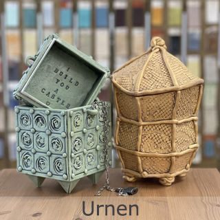 De laatste jaren is er een verschuiving gekomen in mijn werkzaamheden en zet ik mijn aandacht en creativiteit meer in bij het ontwerpen en maken van urnen en gedenkobjecten. Zelf (mee)werken aan een ontwerp en/of het maken van een gedenkteken of urn kan veel positiefs brengen in een rouwproces. In een ontspannen en inspirerende omgeving kan het werken met klei een onderdeel zijn van rouwverwerking en een middel om dierbare herinneringen vorm te geven.